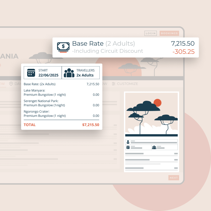 Easily apply circuit discounts across hotels, experiences, transport, flights, and park fees.